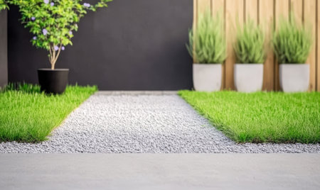 A contemporary garden showcases a neatly arranged pathway of gravel bordered by vibrant grass and planters. Lush foliage offers a calming atmosphere ideal for relaxation.
