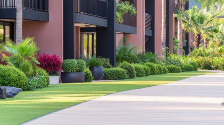 A serene pathway meanders through vibrant greenery flanked by elegant plants and modern architecture in a tropical community. The calming atmosphere invites leisurely strolls.