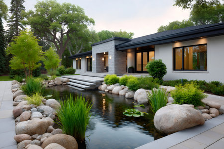 Luxurious house featuring a pond, rocks, and lush landscaping, creating a serene and inviting atmosphere