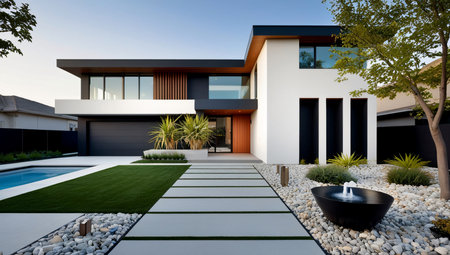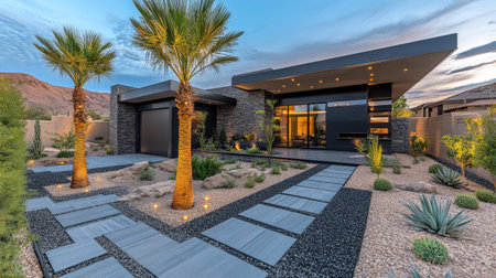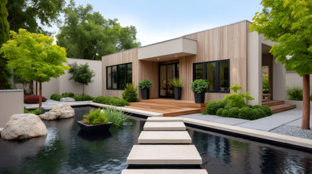 This image captures a modern residential home surrounded by elegant landscaping, featuring serene pathways, soothing water elements, and a tranquil atmosphere at dusk.