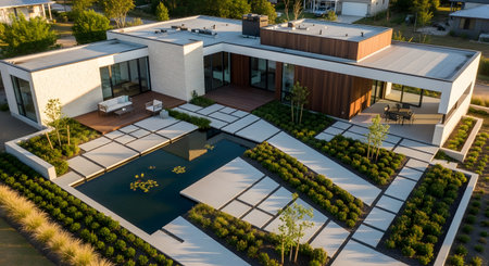 An aerial view of a luxurious modern single-story home featuring a flat roof and wood accents. The backyard boasts a rectangular pool with lily pads, surrounded by geometric stone pathways and manicured landscaping.