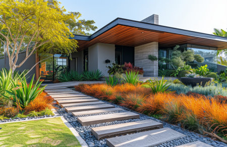 Beautiful landscaping with a variety of plants and stepping stones leading to the entrance of a contemporary home