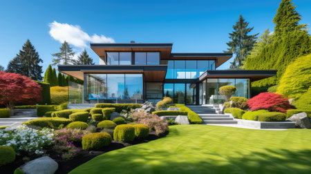 Exterior of modern house with beautiful landscaped garden. Northwest, USA