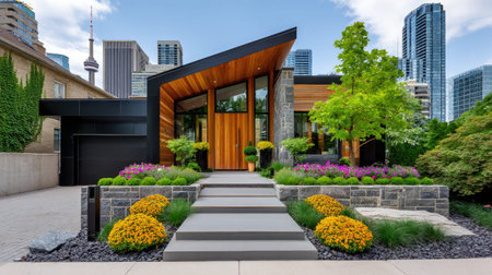 A stunning modern home embraced by meticulously designed gardens showcases a perfect blend of architecture and nature, creating a peaceful retreat in an urban setting.
