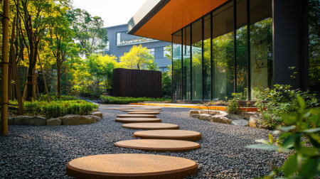 A trail of stepping stones outside a modern wellness center, surrounded by a zen garden.