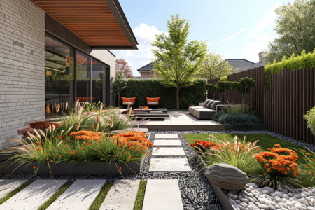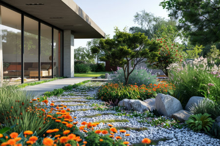 A serene garden pathway leads through lush, colorful vegetation, featuring vibrant orange foliage and neatly placed stones. This modern landscape emanates tranquility and harmony.
