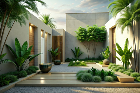 Explore a stunning minimalist garden featuring elegant pathways, lush lawns, and modern architecture, creating an inviting outdoor space perfect for relaxation and enjoyment.