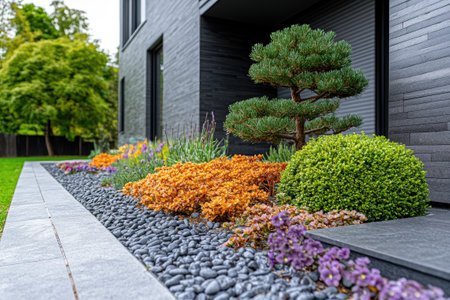 Modern garden design featuring decorative gravel, ornamental shrubs, and a small pine tree next to a contemporary house