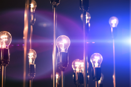 Decorative light bulb glowing in cafe. Idea for shop decoration. Vintage tone