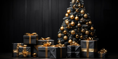 Christmas tree with gifts on black wooden background.