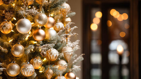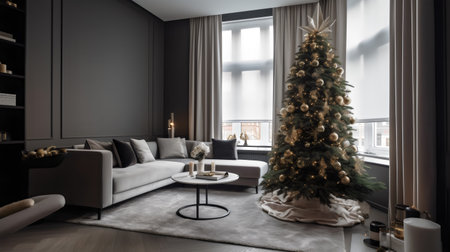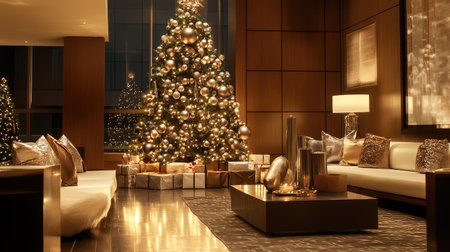 Stylish Christmas tree with metallic decorations and soft lighting, set in a modern room with room for holiday messages.