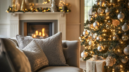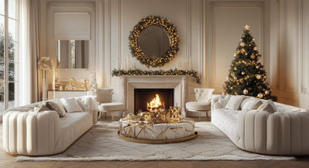 Luxurious living room with holiday decorations and a fireplace for the Christmas season. Concepts of festive home decor, holiday warmth, Christmas celebration.