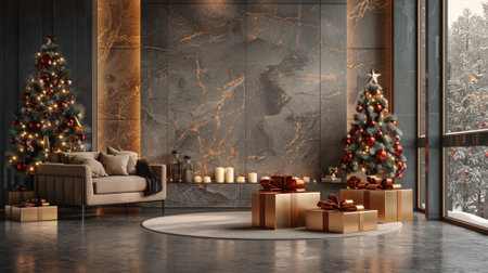 This image showcases an elegant Christmas living room featuring a beautifully decorated tree, surrounded by gifts and a cozy seating area. The modern design complements the festive atmosphere.