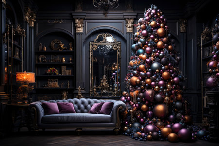 Luxurious Hotel Suite Decorated for the Holidays with Opulent Christmas Tree and Fireplace in Elegant Setting. Concept of Festive Ambiance, Cozy Winter Evenings, Elegant Celebrations.