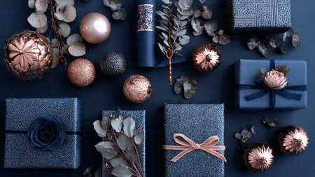 A premium still life of deep-blue foil-wrapped gifts accented with rose-gold ribbons and stars.