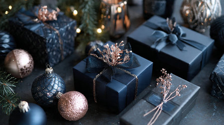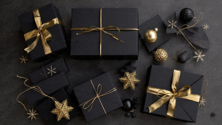 Various beautifully wrapped gifts in black and gold sit on a light surface, surrounded by decorative golden balls and star shapes, creating a festive holiday atmosphere..