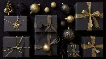 Matte-black gift boxes wrapped in elegant gold ribbons form a luxurious holiday display.
