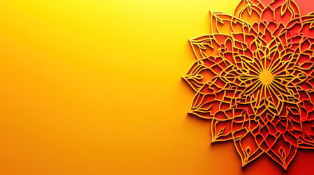 A vertical background with Islamic geometric patterns and stars, white space on the left for text or design, and an orange gradient in shades of yellow to red. The pattern is symmetrical and has intricate shapes that form floral designs. It includes two decorative paper cutouts, giving it a three-dimensional effect. This design would be suitable as a banner or header for Ramadan-themed events to showcase traditional Arab culture. --chaos 30 --ar 16:9 --v 6.1 Job ID: 9afa70eb-5713-47a7-b371-dc286ca9db80