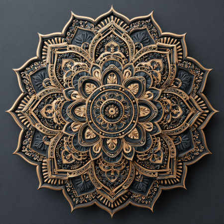 Intricate wall art, floral mandala design, layered, dark tones with gold accents
