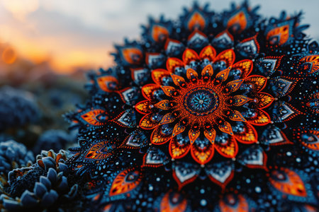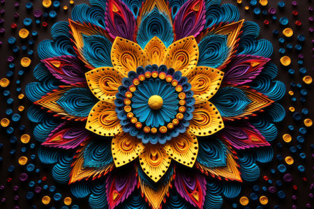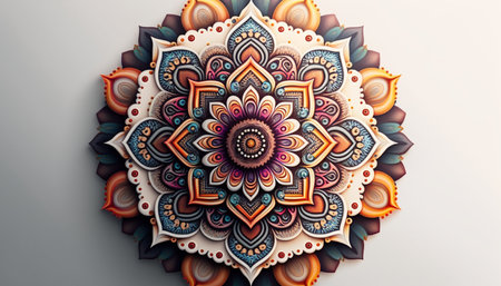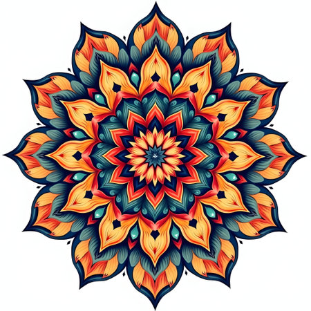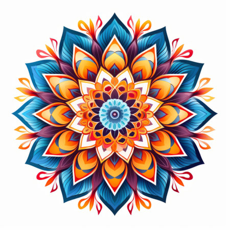 a decorative flower artwork featuring colorful ornaments and floral decoration on a white background. this piece showcases a unique blend of dark orange and azure colors, with multilayered dimensions. it incorporates spiritual symbolism, circular shapes, and elements reminiscent of tattoo and optical illusion paintings. the artwork also draws inspiration from indian motifs. ai generated