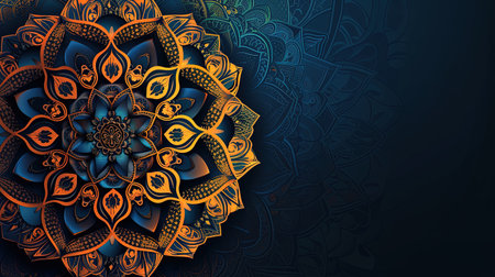 Intricate kaleidoscopic pattern with a star-shaped center, featuring rich blue and orange hues with a symmetrical design. AI Generation