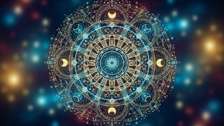 A detailed celestial mandala featuring moon phases, stars, and intricate geometric patterns in gold and blue against a dark, bokeh-filled background.