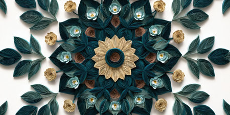Delicate paper flowers and leaves are arranged in a beautiful circular pattern. The design features various shades of green, tan, and soft colors, creating harmony.