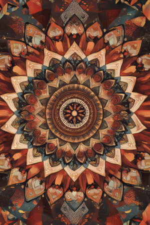 A lively, boho inspired mandala pattern with intricate geometric details and a rich, earthy color palette of deep reds, oranges, and browns.