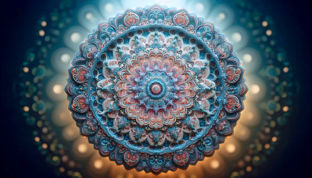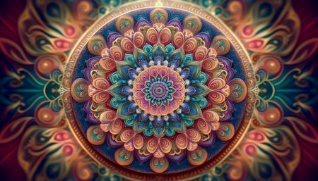 A symmetrical mandala design with vibrant, intricate patterns on a deep, contrasting background.