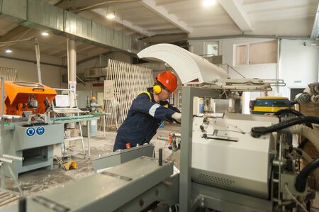 Tyumen, Russia - November 30, 2017: Workshop of Mostootryad-36 Factory. Plastic window and door manufacturing. Worker cutting PVC profile