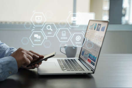 Digital Marketing Technology Solution for Online Business conceptual - Graphic interface showing analytic diagram of online market promotion strategy on digital advertising platform via social media.