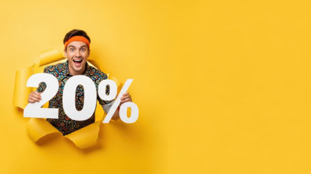 excited young man looking through hole in yellow paper with percent sign