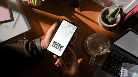 Top view of male hands showing smartphone include clipping path on wooden study table