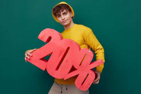 a joyful man stands on a green background in bright clothes and holds a huge figure of twenty percent, red, with a wide smile on his face. Horizontal Studio Photography