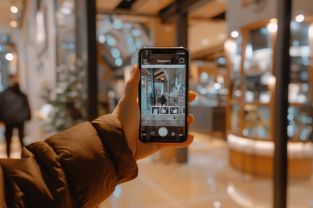 A person is holding a cell phone up to take a picture of a store. The image has a moody, mysterious feel to it, as if the person is capturing a moment of discovery or exploration
