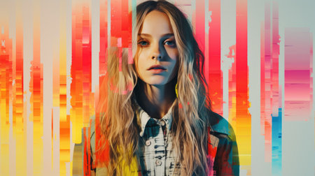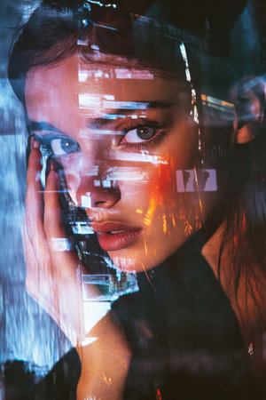 Closeup portrait of a young woman with double exposure and glitch art effects in photography