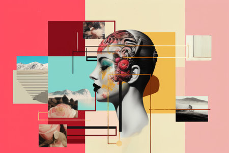 A trendy paper collage wall art, combining retro ads and modern graphic designs, under soft studio lighting , advertise photo