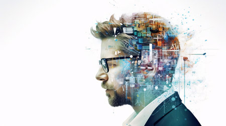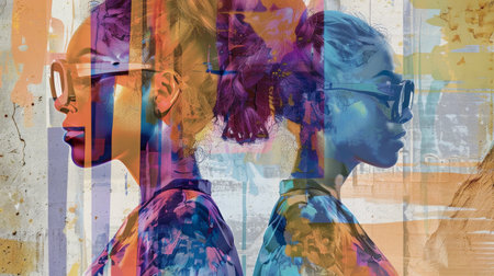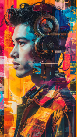 A contemporary digital art piece depicting a fragmented portrait with vibrant colors and geometric patterns on a creative backdrop