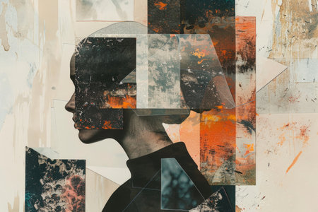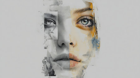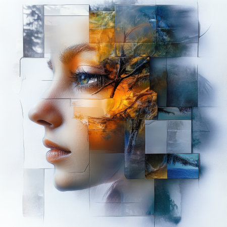 A creative portrait blending art and digital imagery, capturing emotions and stories within a fragmented visual narrative.