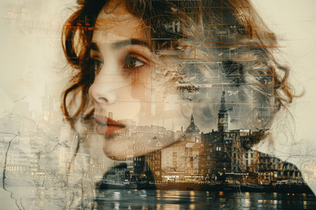 Double exposure portrait of beautiful young woman with long curly hair and cityscape in the background