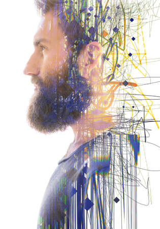 Male caucasian teen with distorted digital effect and fragmented overlay.