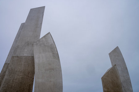 August 2020 - Bubanj Nis, Serbia: Socialist Brutalism Modernism abandoned communist huge concrete monument in shape of fists - symbol of resistance of partisans against fascism black and white photo