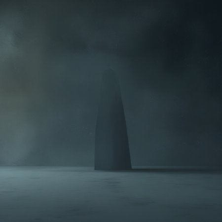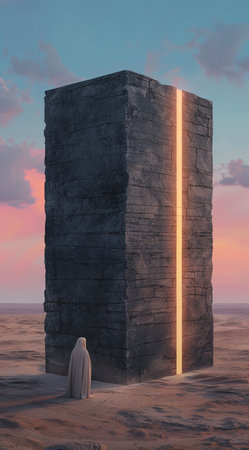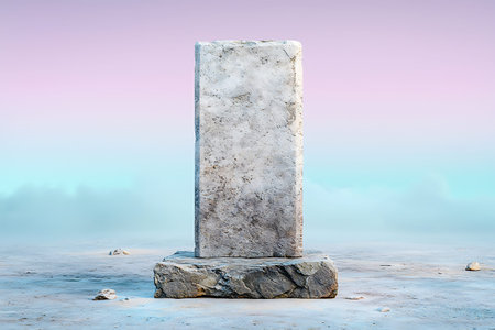 A captivating stone monument stands in isolation against a pastel-hued sky filled with soft clouds. This surreal landscape invites contemplation and evokes a sense of tranquility.