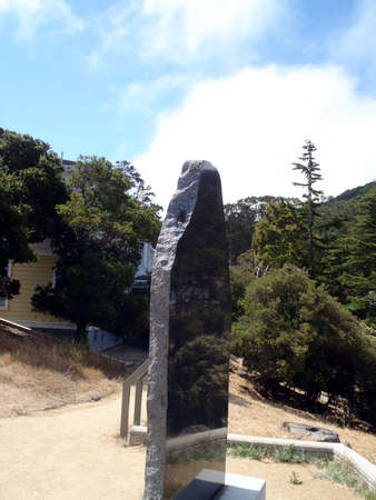 Stone honoring the Chineses experience at the immigration station on Angel Island with housing unit in the background.