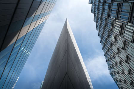 underside panoramic and perspective view to steel blue glass high rise building skyscrapers, business concept of successful industrial architecture