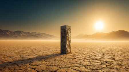 An lone stone pillar rises from expansive, fissured earth beyond rolling dunes under a crisp, cloudless sky, evoking solitude and enduring silence.