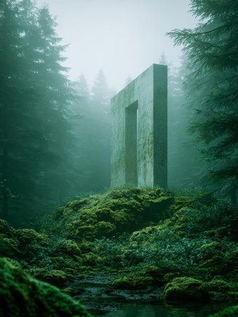 An ancient, weathered concrete structure rises subtly within dense, emerald foliage, shrouded in mist, evoking an aura of mystery and timeless serenity.