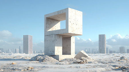 Minimalist concrete monolith block in open horizon landscape, 3d rendering