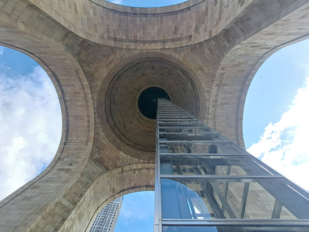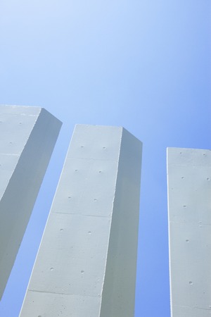 Tall white pillars towards reach the bright blue sky creating a striking architectural scene.