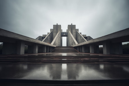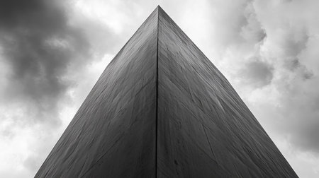 A grey monolithic structure towering against a cloudy sky, symbolizing modern architecture